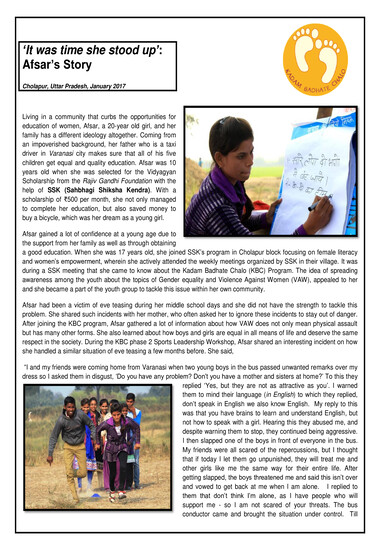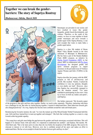 Kadam Badhate Chalo (KBC) is a youth-led program implemented by PSD in partnership with Martha Farrell Foundation (MFF) and PRIA. It empowers youth to challenge gender stereotypes and take leadership within their communities to address violence against women and girls.